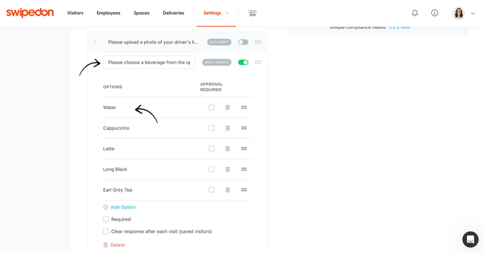 - From the SwipedOn Web Dashboard, go to Visitor Settings > Fields and add a new Multi-choice field