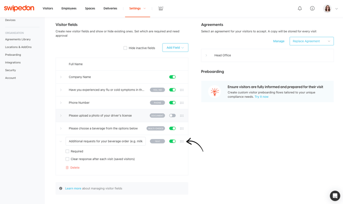 If you would like to offer visitors a beverage and/or food on arrival, you can do so by adding this as a visitor field.