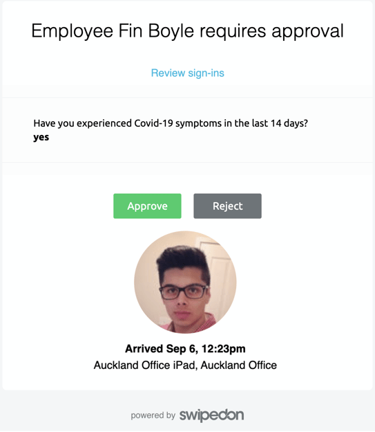 When 'Require approval if' is enabled within the 'Employee sign in questions' view, the admins at the employee's location will receive an email notification asking to approve or reject the employee sign-in.